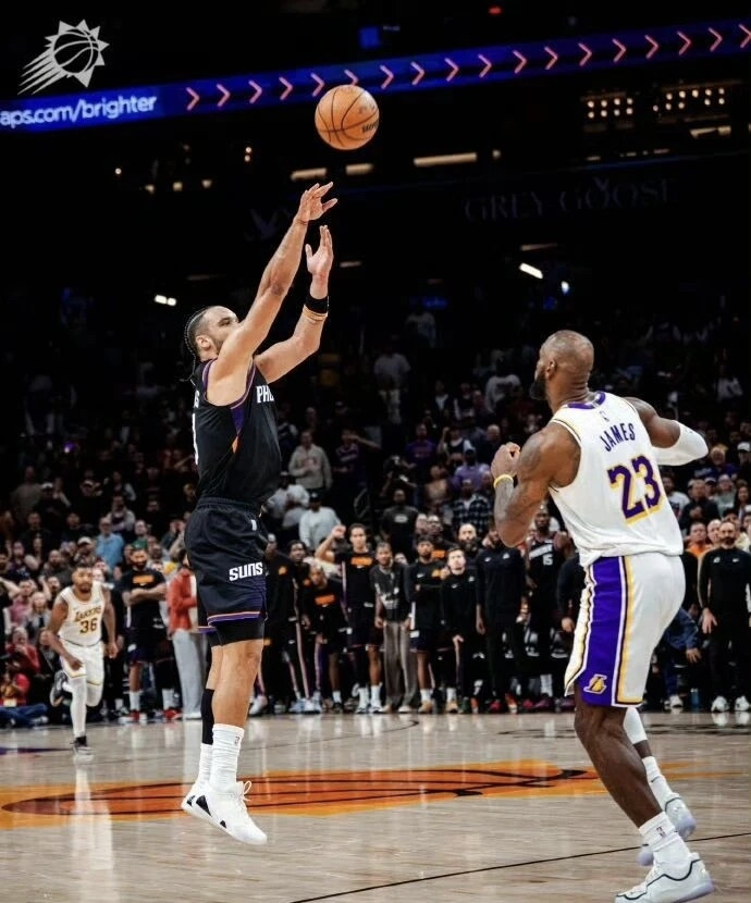 更戏剧性的还在后面!第三节后半段,狄龙因为肘击老詹领到第五犯,被迫下场休息。没了他的搅局,湖人直接开启屠杀模式,一波24-0的攻击波疯狂收割比赛,最多领先到18分,看得人以为比赛已经提前进入垃圾时间。可谁能想到,第四节狄龙一回来,太阳竟然原地复活,布克连续单打撕开防线,狄龙和队友们接连命中4记三分,一波12-0的攻势直接把分差追了回来,赛场气氛再次拉满。