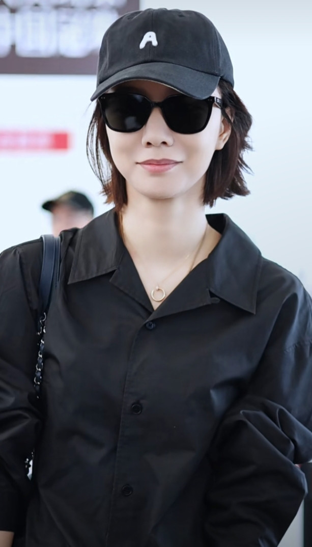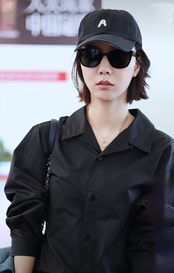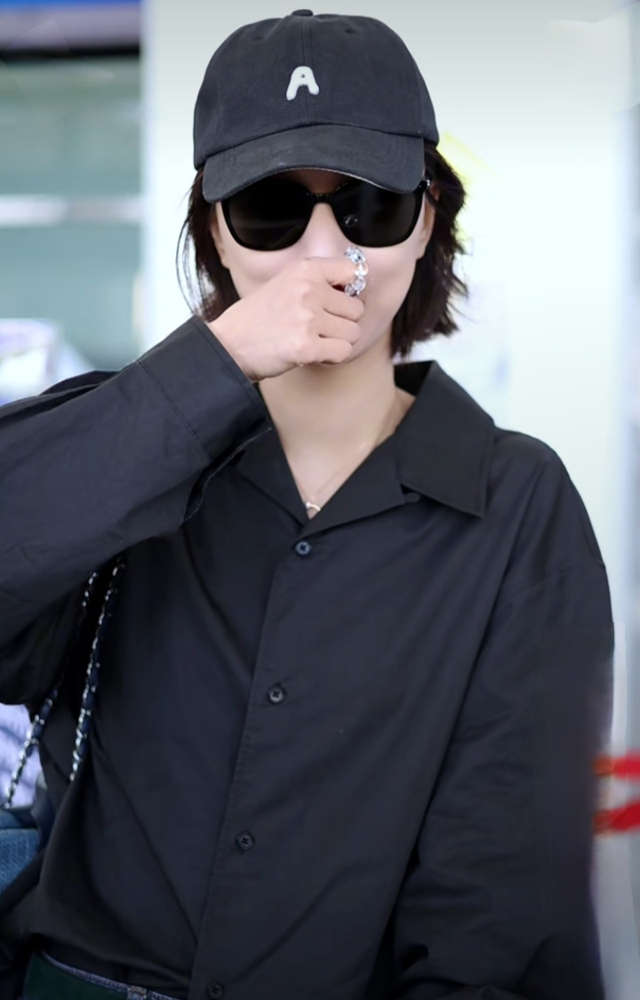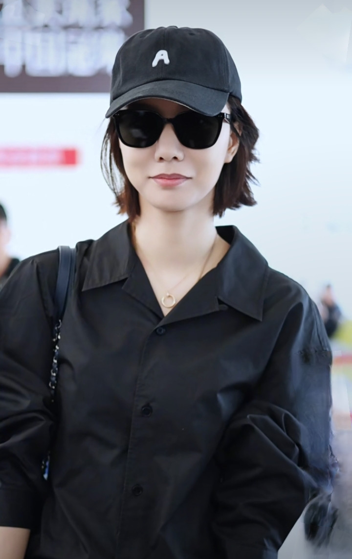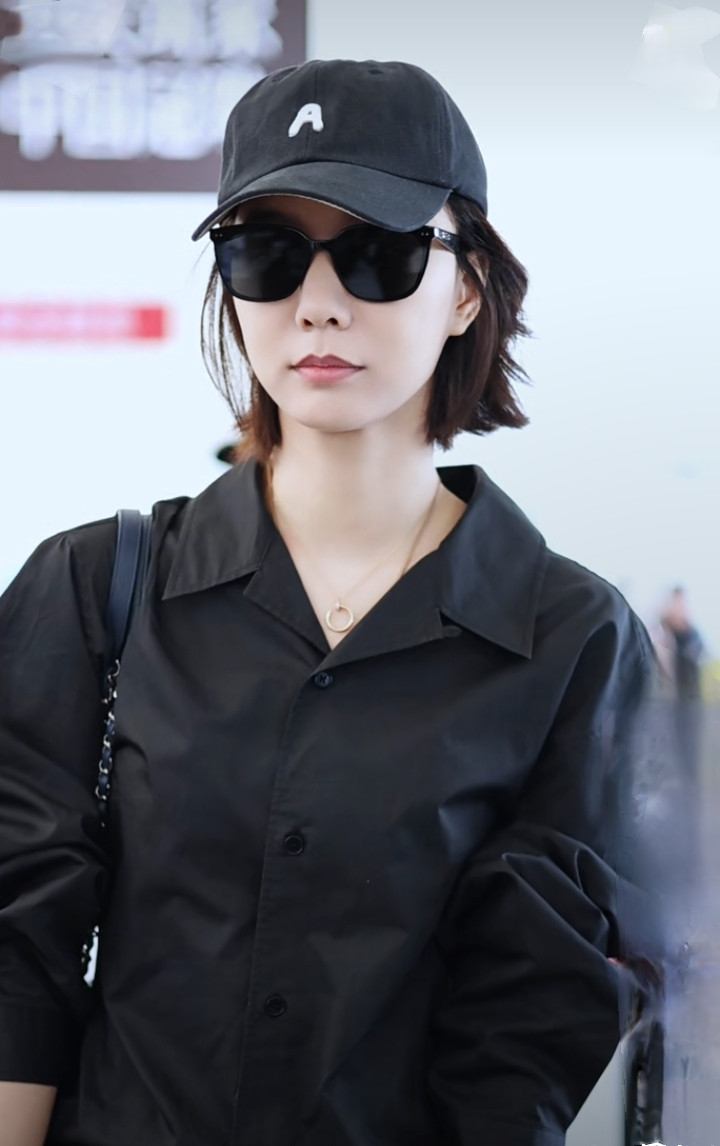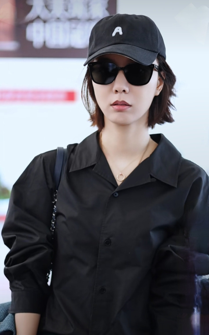 王珞丹现身机场, 黑色衬衫搭棒球帽短发造型尽显清爽气质美到失语