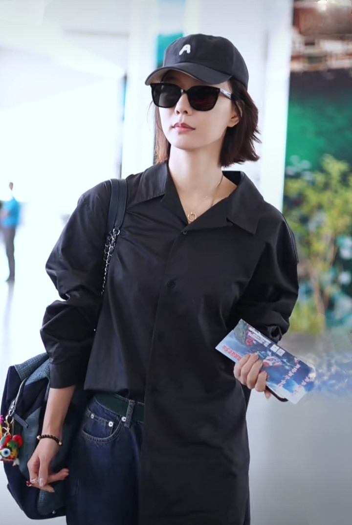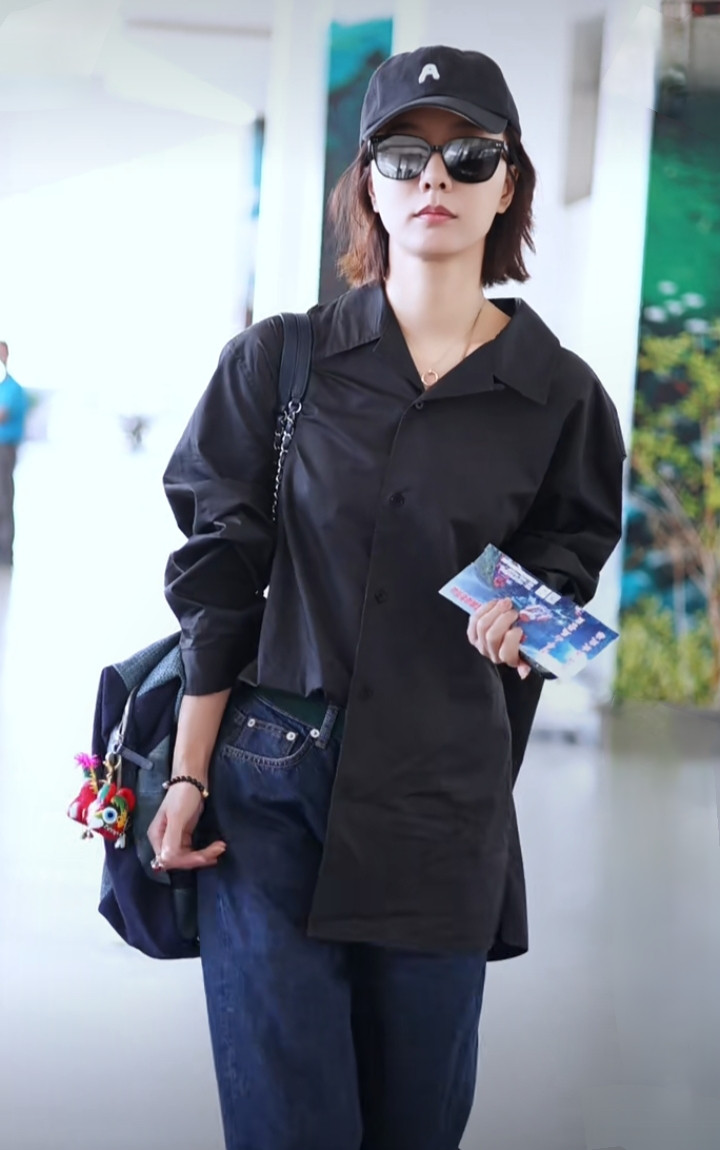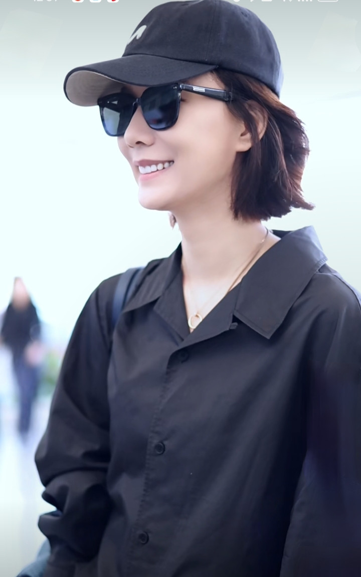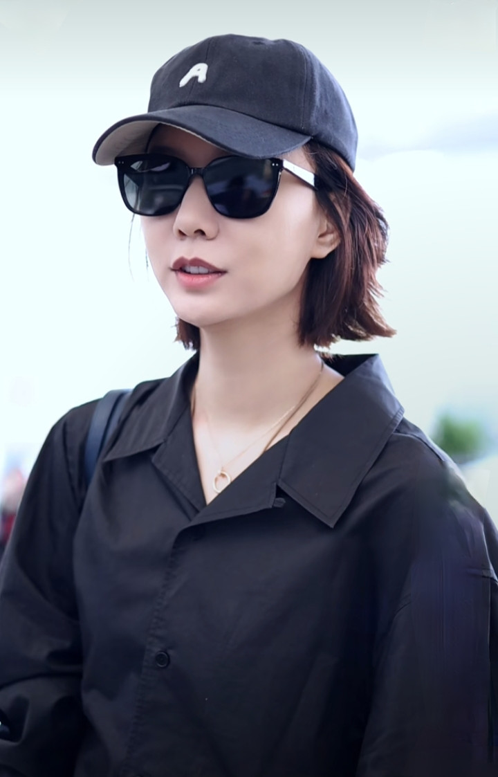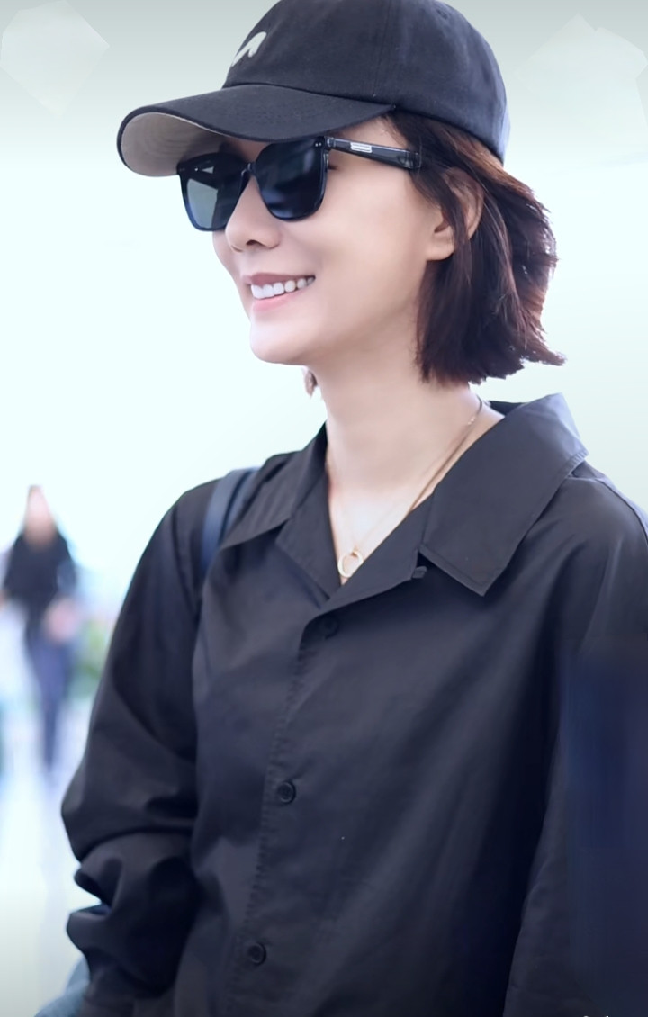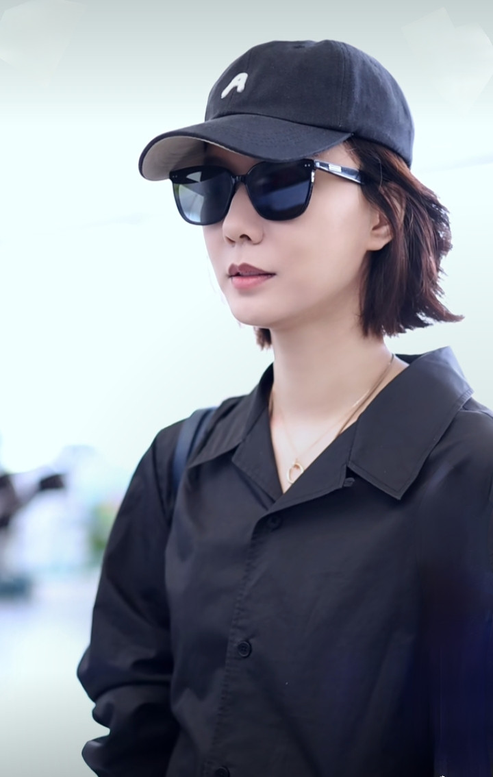 王珞丹现身机场, 黑色衬衫搭棒球帽短发造型尽显清爽气质美到失语