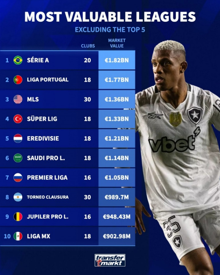 直播吧11月4日讯世界足球的中心在欧洲,欧洲五大联赛毫无疑问是世界最具价值的足球联赛。德转统计了除五大联赛之外,最有价值联赛的榜单,其中巴甲以18.2亿欧元的市场价值排名第1。