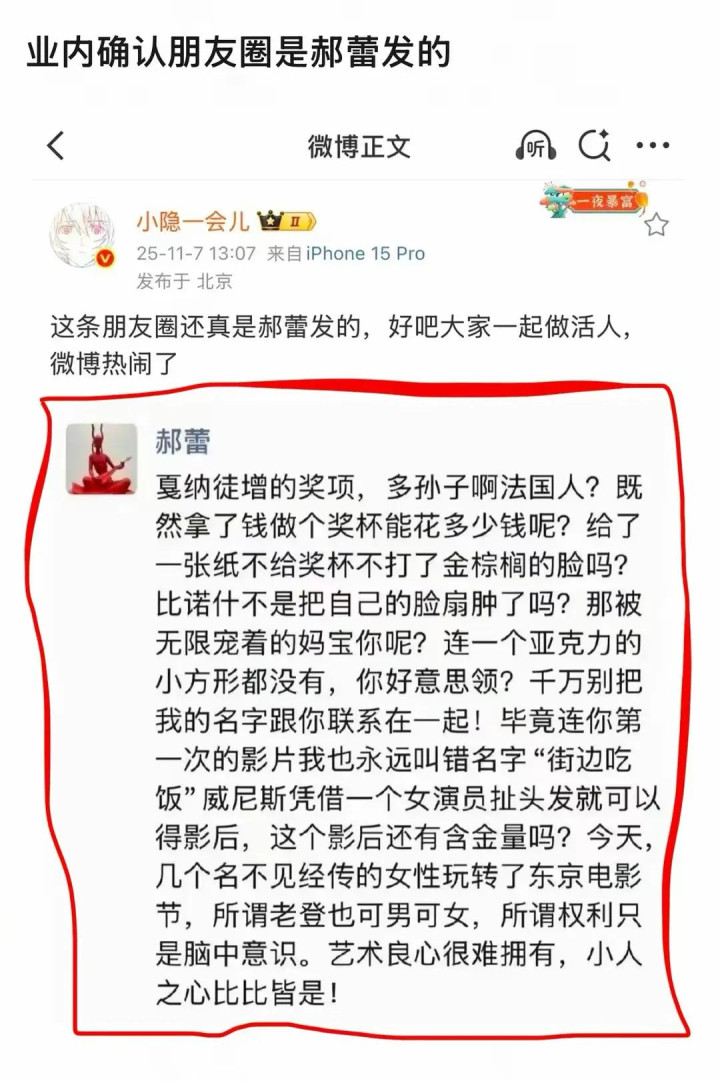 郝蕾的朋友圈曝光,大段的文字满是尖锐措辞,对三大电影节无差别攻击,内幕全抖了出来。