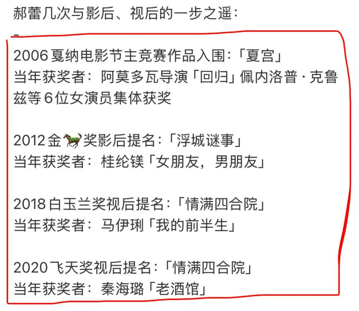都说拿奖得占尽天和地利人和,而郝蕾就总差那么一点机缘,几次与影后、视后失之交臂。