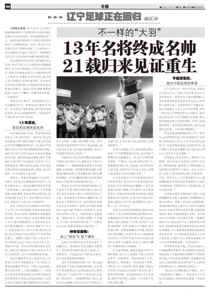 但在这样的历史时刻,我们最终还是没有“放过”这位辽宁足球的昔日偶像级球员,今日的功勋教练,尤其是过往的13年,李金羽的教练生涯可以用漂泊和坎坷二字来形容,但最终在家乡沈阳,他完成了真正的蜕变:名将终成名帅。采访结束送别李金羽的时候,记者赫然发现李金羽鬓角已经斑白,他说过往的2025赛季就是熬心血的一个赛季,但最终成功冲超,一切都值得。