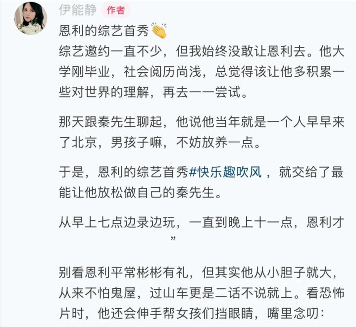 她嘴上说着“要不下次让我坐轿子进场”,其实心里明白,这事儿八成是秦昊在中间“和稀泥”。听说当时导演让恩利钻桌底,秦昊还在边上打圆场:“回去了千万别告诉你妈。”听听,这话说的,跟俩男人合伙瞒着家里那位似的,可不就是哥们儿氛围吗?伊能静边写边念叨,说这父子俩处得比亲生的还自在,倒显得她这个亲妈有点多余了。