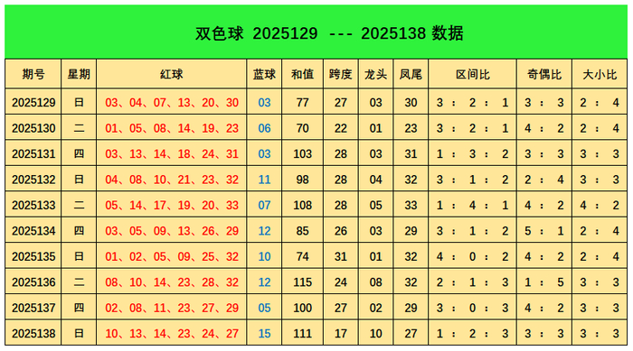 上期回顾:双色球第2025138期开出奖号:红球10、13、14、23、24、27;蓝球15,其中红球三区比为1:2:3,奇偶比3:3,大小比为3:3,蓝球开出0路号码15。